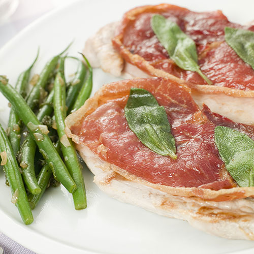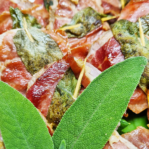feinstes Kalbfleisch umwickelt mit Parmaschinken, bespickt mit Salbei