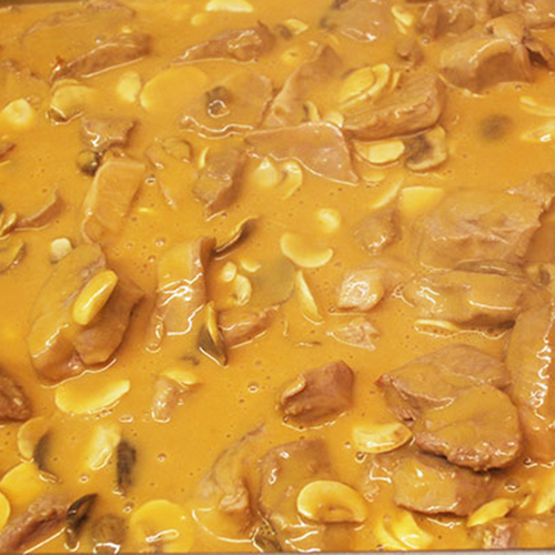 Feines, zartes Schweinegeschnetzeltes, in cremig-deftiger Rahmsoße mit Zwiebeln und frischen Champignons aromatisiert